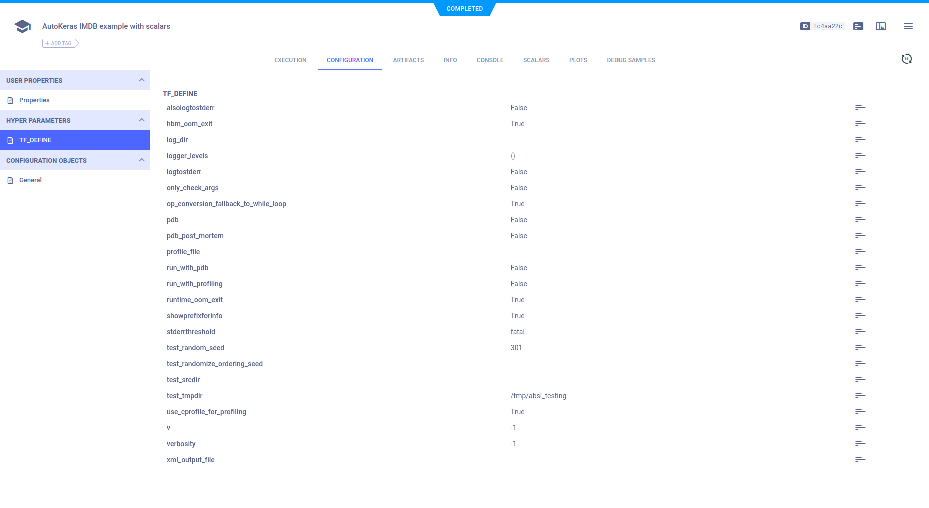 ClearML automatically logs TensorFlow Definitions. They appear in CONFIGURATION > HYPERPARAMETERS > TF_DEFINE.