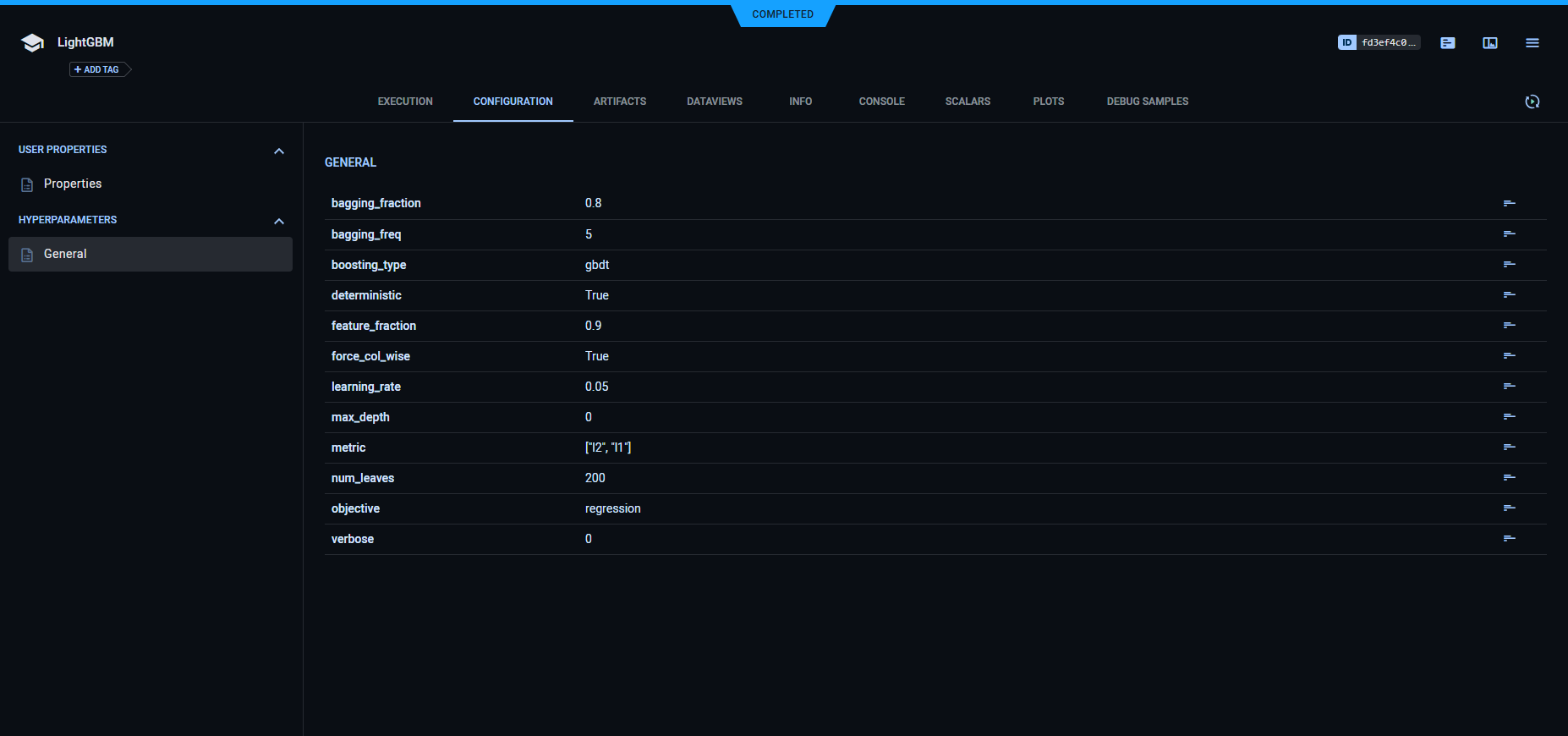 ClearML automatically logs the configurations applied to LightGBM. They appear in CONFIGURATIONS > HYPERPARAMETERS > GENERAL.