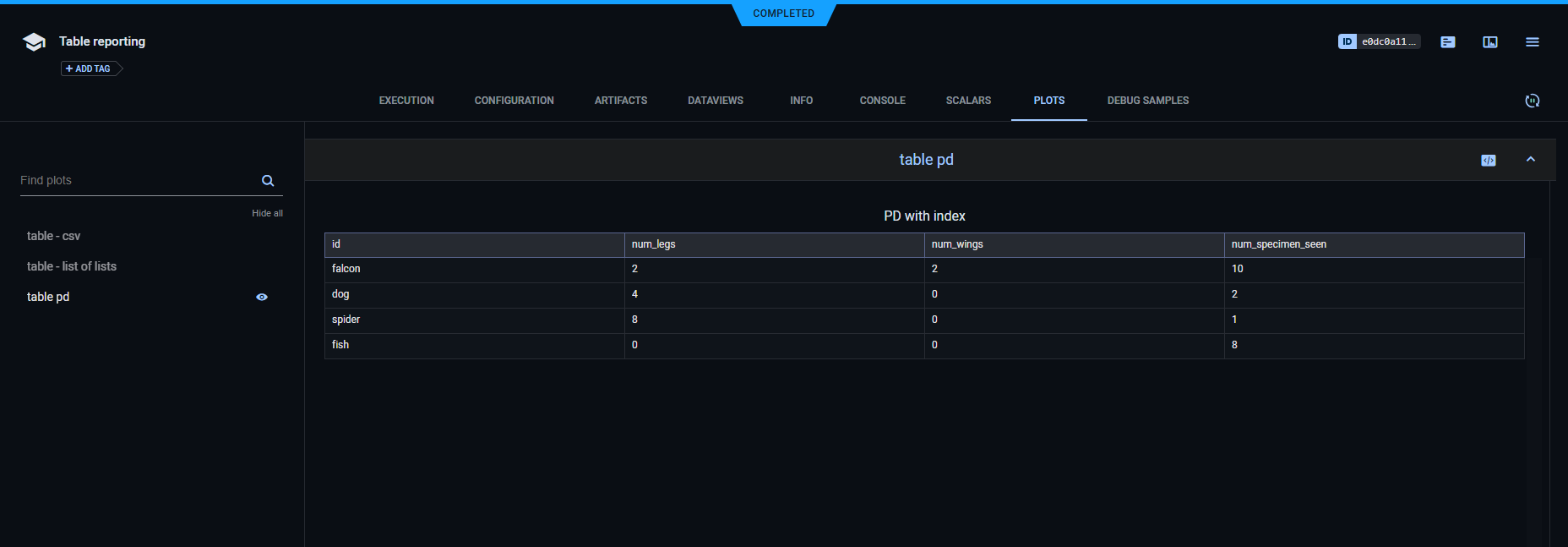 ClearML reports these tables, and displays them in the ClearML Web UI > task's PLOTS tab.