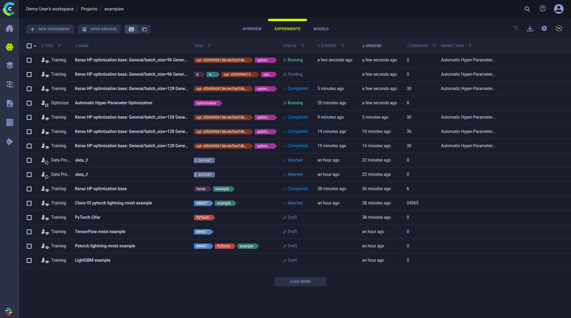 It's also possible to tag Tasks for visibility and filtering allowing you to add more information on the execution of the experiment. Later you can search based on task name in the search bar, and filter experiments based on their tags, parameters, status, and more.