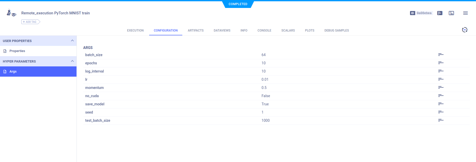 ClearML automatically logs command line options defined with argparse. They appear in CONFIGURATION > HYPERPARAMETERS > Args.
