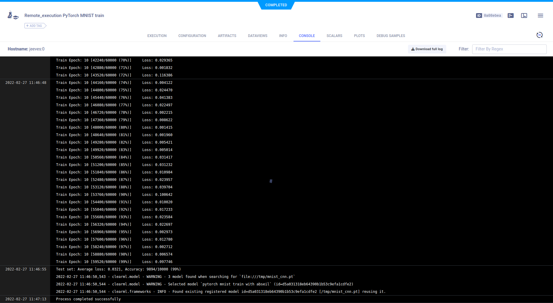 Models created by the experiment appear in the experiment’s ARTIFACTS tab. ClearML automatically logs and tracks models and any snapshots created using PyTorch.