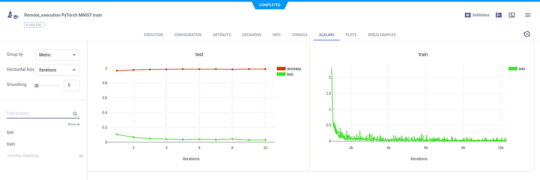 These scalars can be visualized in plots, which appear in the ClearML web UI, in the experiment's SCALARS tab.