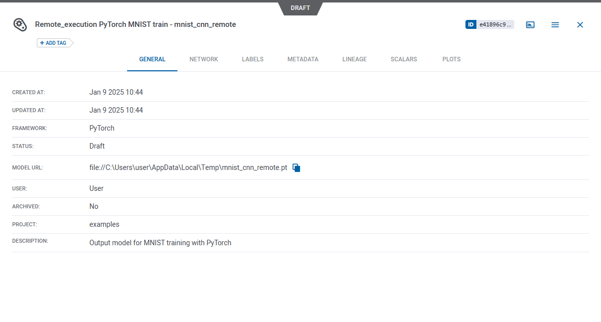 Models created by the task appear in the task's ARTIFACTS tab. ClearML automatically logs and tracks models and any snapshots created using PyTorch.