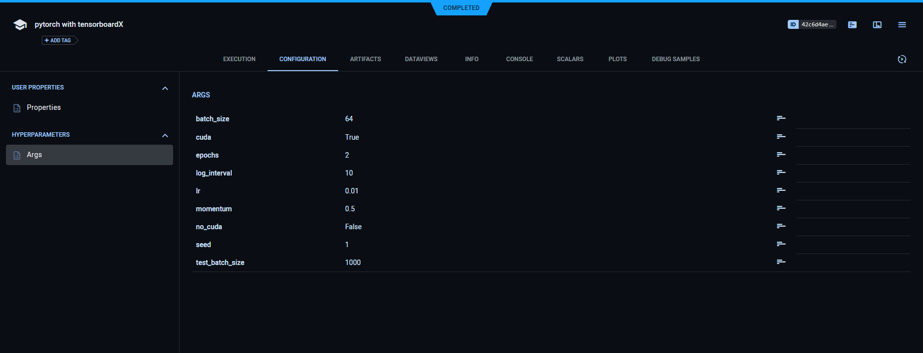 Models created by the task appear in the task's ARTIFACTS tab. ClearML automatically logs and tracks models and any snapshots created using PyTorch.