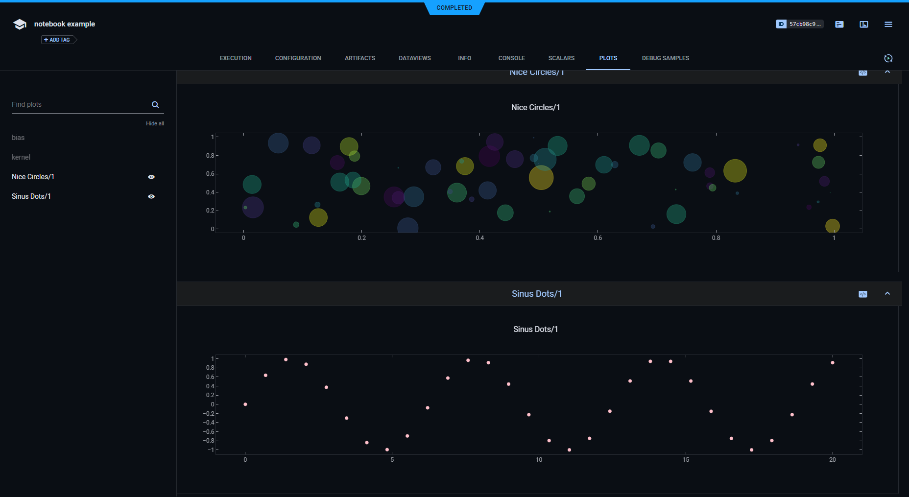 The jupyter.ipynb example demonstrates ClearML's automatic logging of code running in a Jupyter Notebook that uses Keras and Matplotlib.