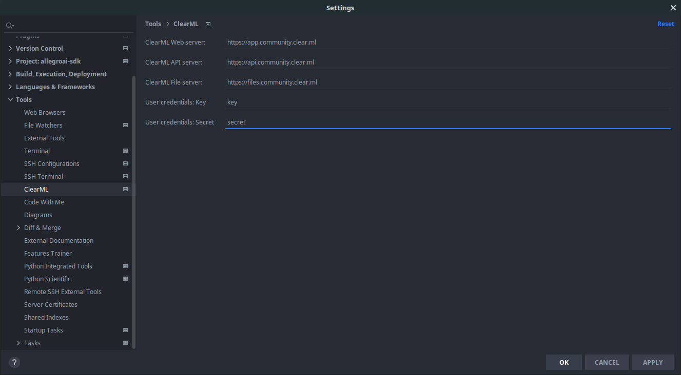 In PyCharm, open Settings > Tools > ClearML.