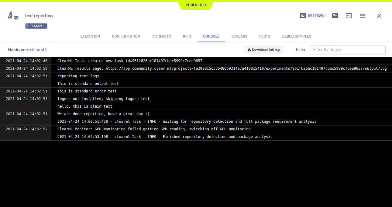 The text_reporting.py script demonstrates reporting explicit text, by calling the Logger.report_text method.