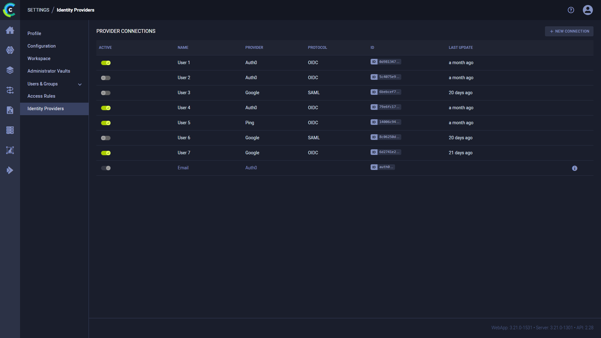 Administrators can connect identity service providers to the server: configure an identity connection, which allows ClearML to communicate with your identity provider, retrieve user information, authenticate users, and more. Once an identity provider connection is configured and enabled, the option appears in your server login page.