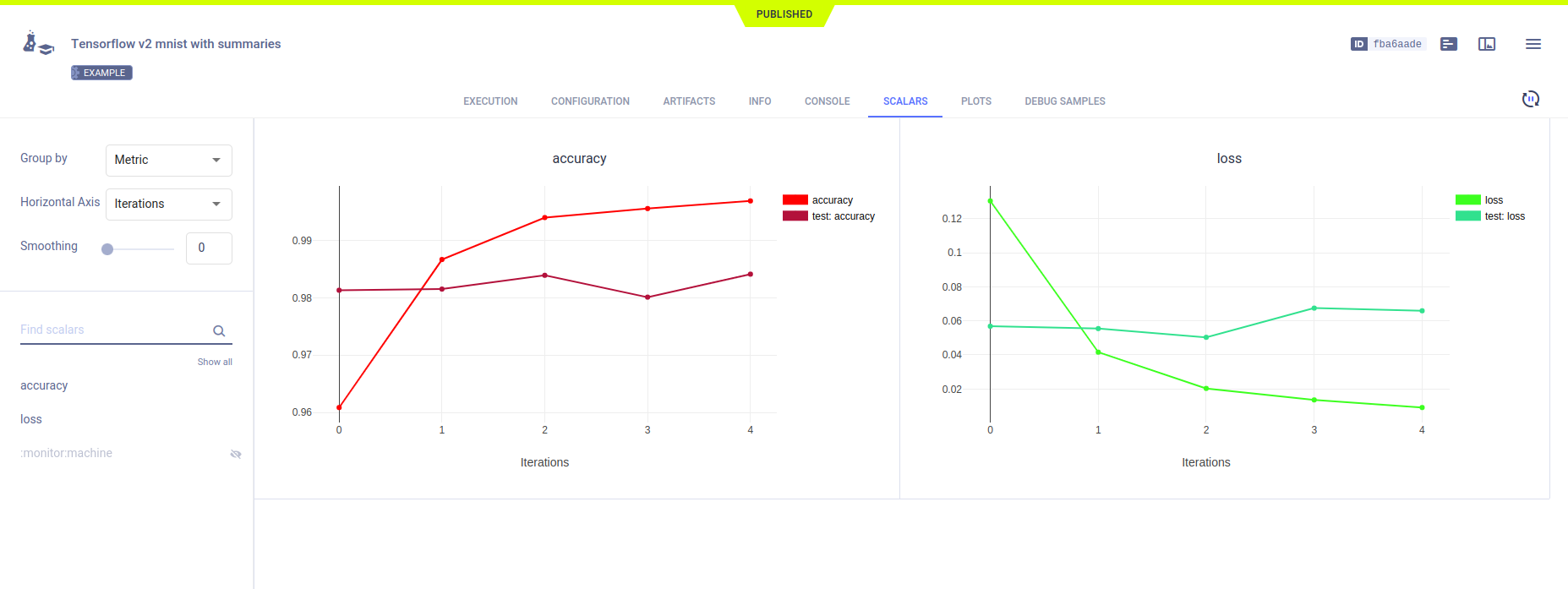 The tensorflow_mnist.py example demonstrates the integration of ClearML into code that uses TensorFlow and Keras to train a neural network on the Keras built-in MNIST handwritten digits dataset.