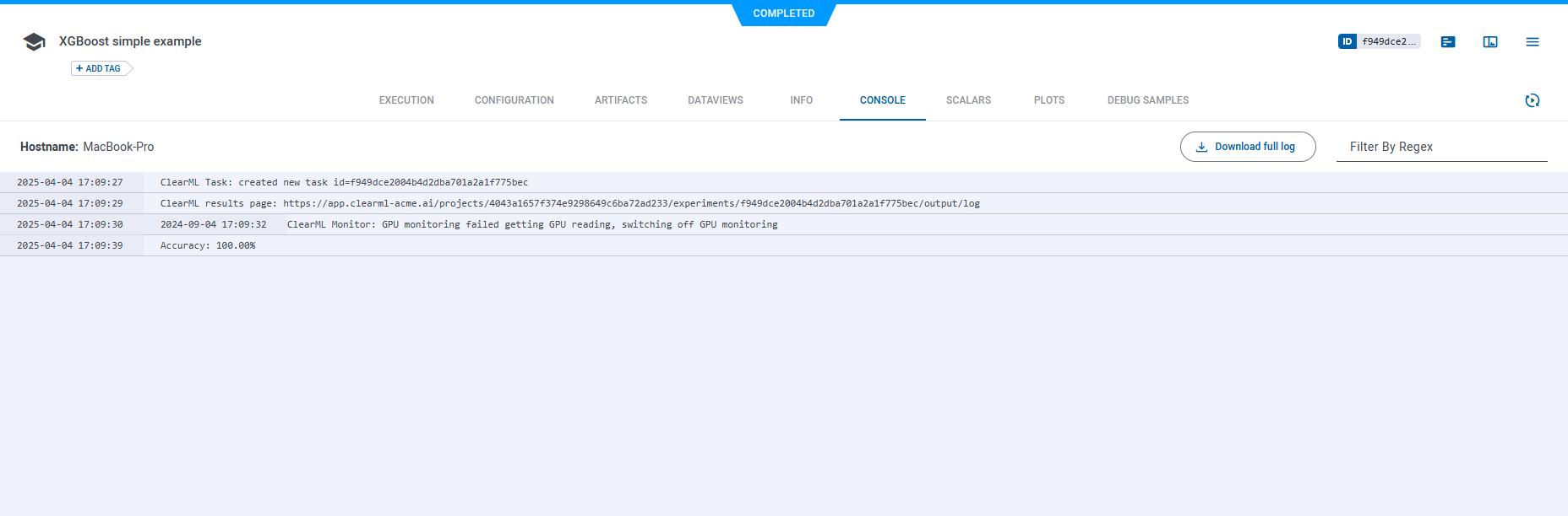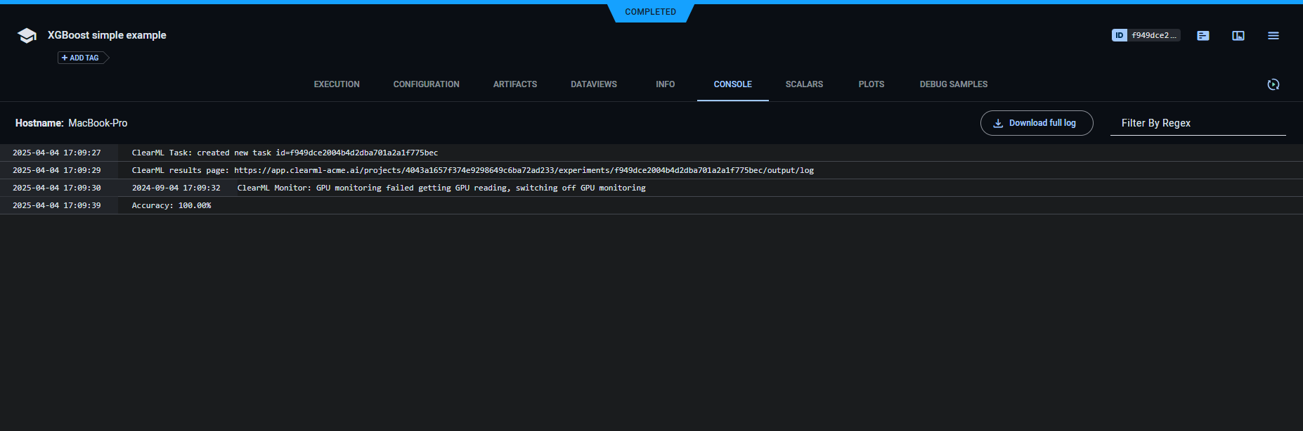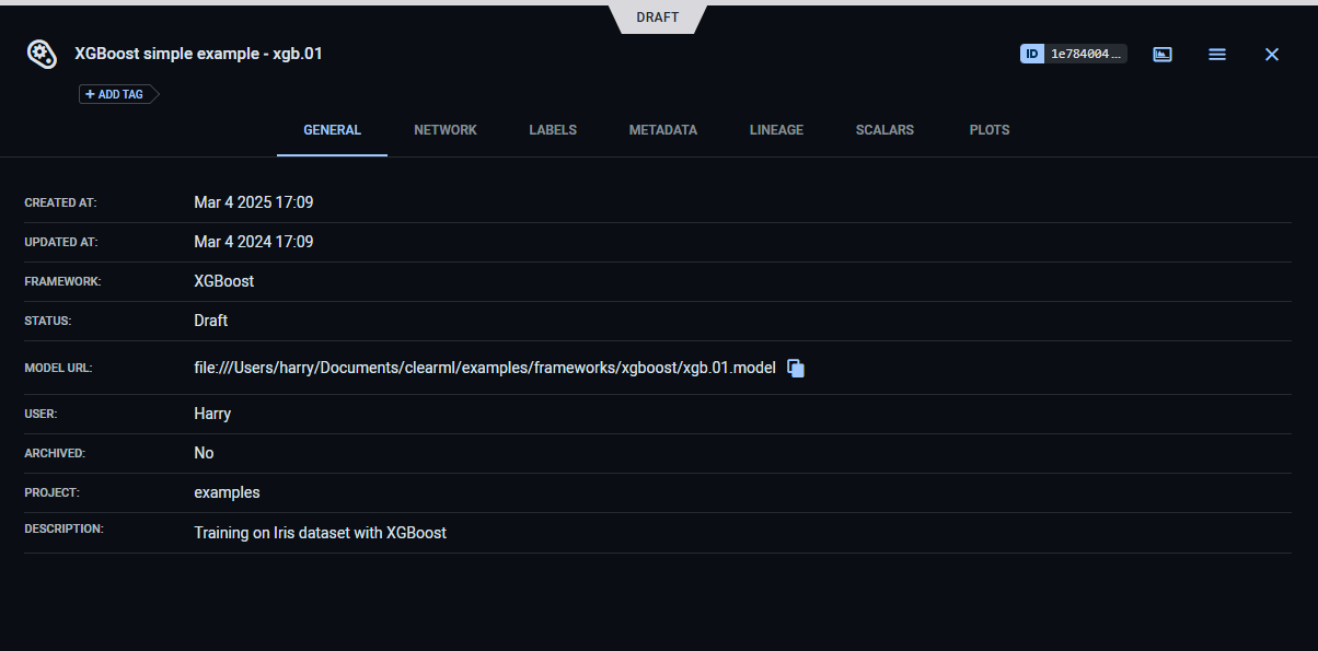 Models created by the task appear in the task's ARTIFACTS tab. ClearML automatically logs and tracks models and any snapshots created using XGBoost.