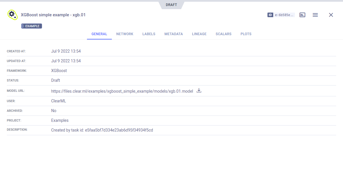 Models created by the task appear in the task's ARTIFACTS tab. ClearML automatically logs and tracks models and any snapshots created using XGBoost.
