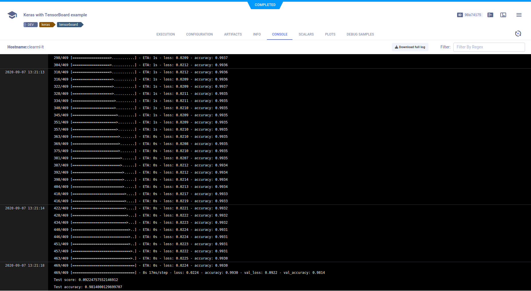 The example below demonstrates the integration of ClearML into code which uses Keras and TensorBoard. View it in script or in Jupyter Notebook.