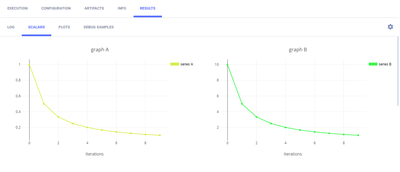logger.report_scalar("graph B", "series B", iteration=i, value=10./(i+1))