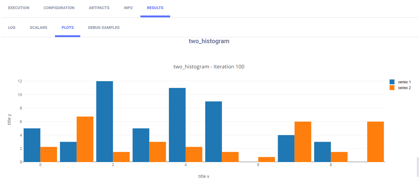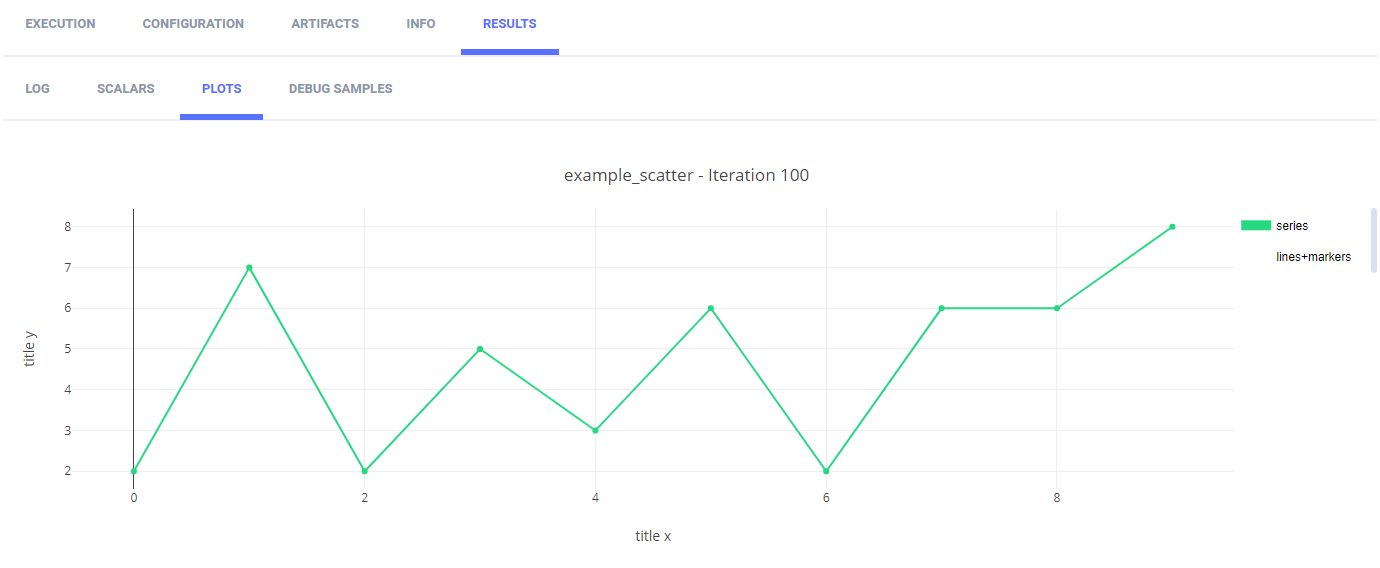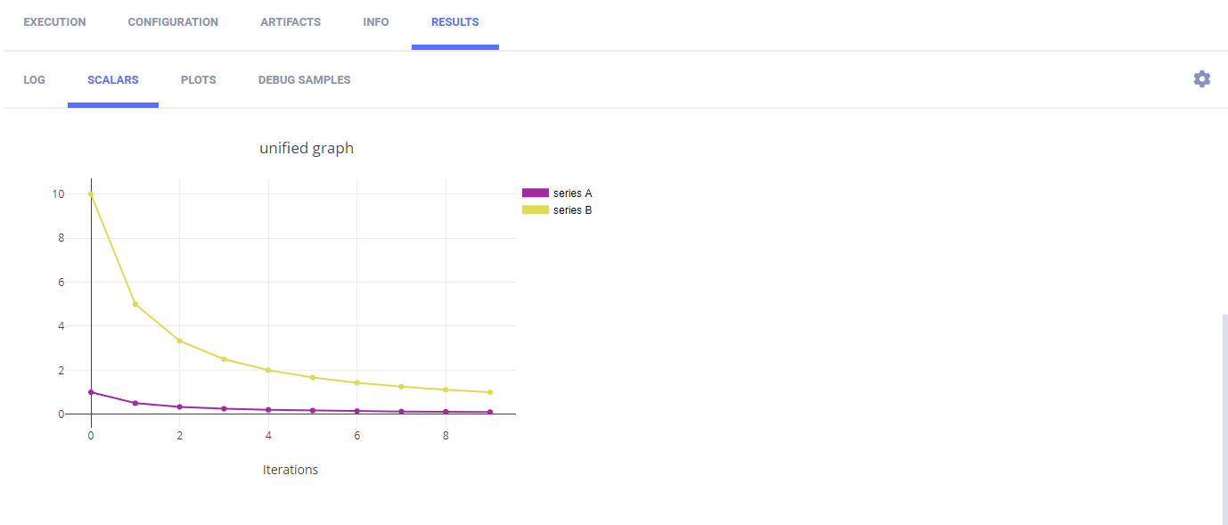 To reports scalars, call the Logger.report_scalar method. The scalar plots appear in the web UI in RESULTS > SCALARS.
