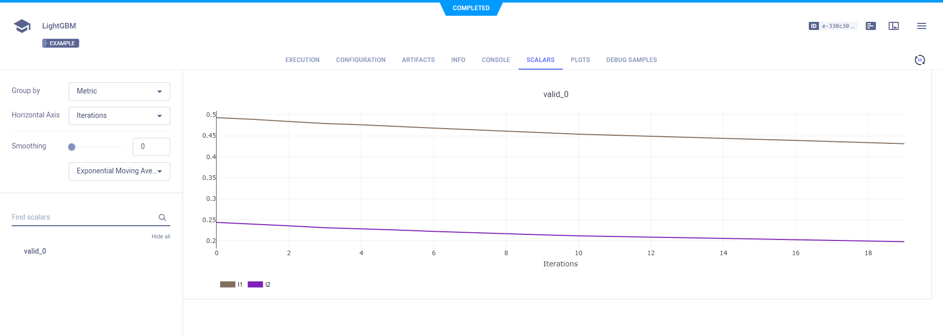 The lightgbm_example script demonstrates the integration of ClearML into code that uses LightGBM.