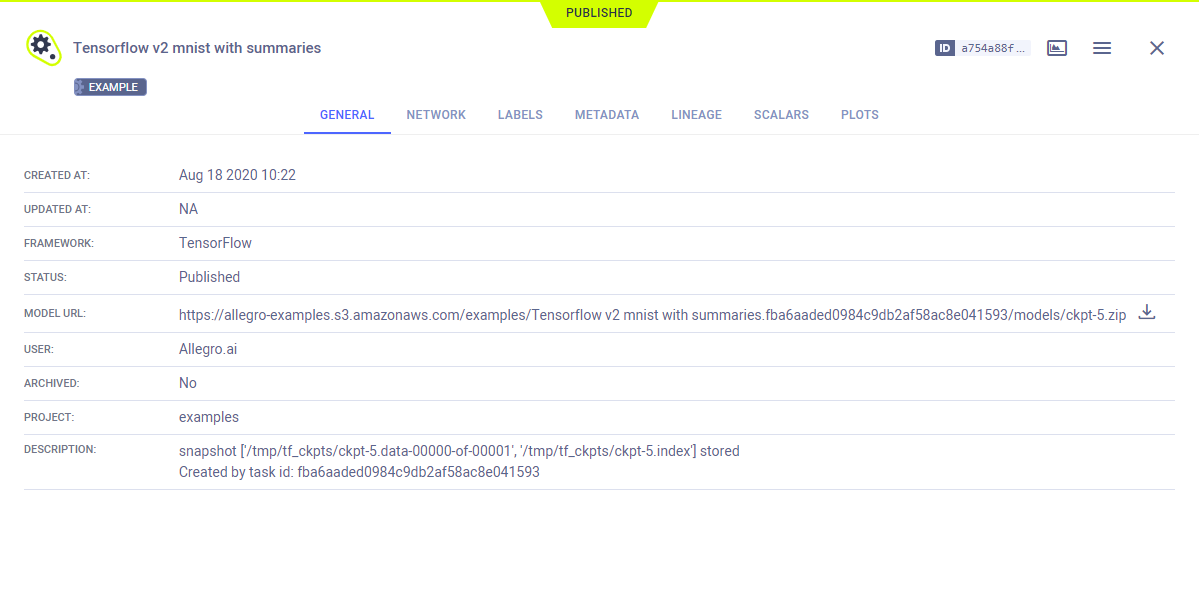 Models created by the experiment appear in the experiment's ARTIFACTS tab. ClearML automatically logs and tracks models and any snapshots created using TensorFlow.