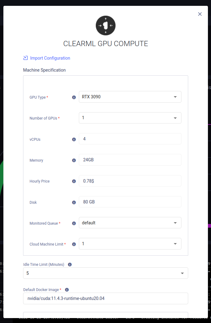 - Default Docker Image (Optional) - Default Docker image in which the ClearML Agent will run. Provide a Docker stored in a Docker artifactory so instances can automatically fetch it