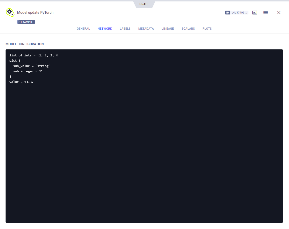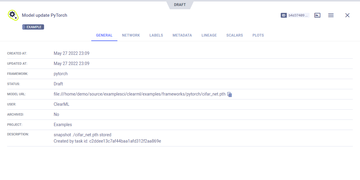 - Uses an OutputModel object to log the model, its label enumeration and configuration dictionary.