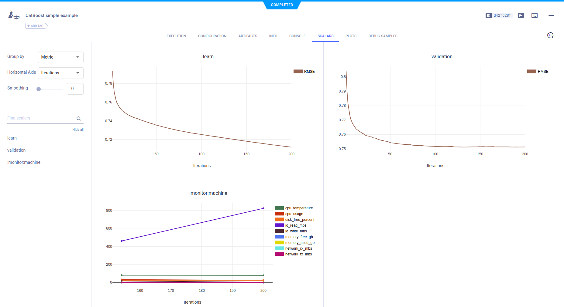 ClearML automatically captures scalars logged by CatBoost. These scalars can be visualized in plots, which appear in the ClearML web UI, in the experiment's page > SCALARS.