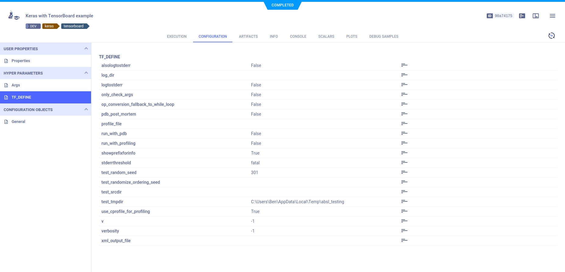 ClearML automatically logs command line options generated with argparse, and TensorFlow Definitions.