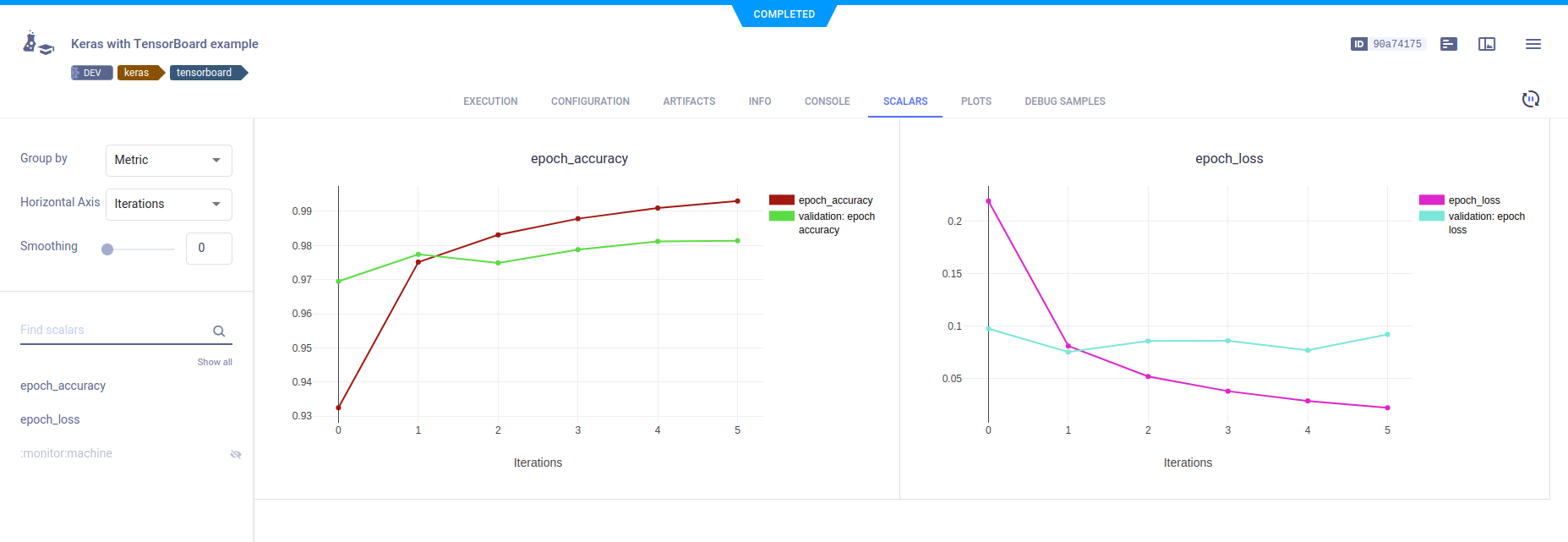 The example below demonstrates the integration of ClearML into code which uses Keras and TensorBoard. View it in script or in Jupyter Notebook.