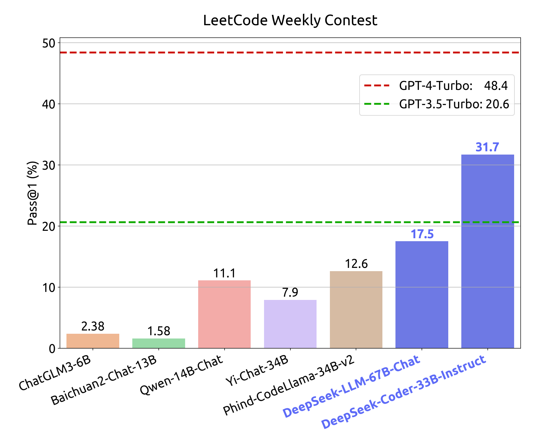 LeetCode Weekly Contest: To assess the coding proficiency of the model, we have utilized problems from the LeetCode Weekly Contest (Weekly Contest 351-372, Bi-Weekly Contest 108-117, from July 2023 to Nov 2023). We have obtained these problems by crawling data from LeetCode, which consists of 126 problems with over 20 test cases for each. The evaluation metric employed is akin to that of HumanEval. In this regard, if a model's outputs successfully pass all test cases, the model is considered to have effectively solved the problem. The model's coding capabilities are depicted in the Figure below, where the y-axis represents the pass@1 score on in-domain human evaluation testing, and the x-axis represents the pass@1 score on out-domain LeetCode Weekly Contest problems.