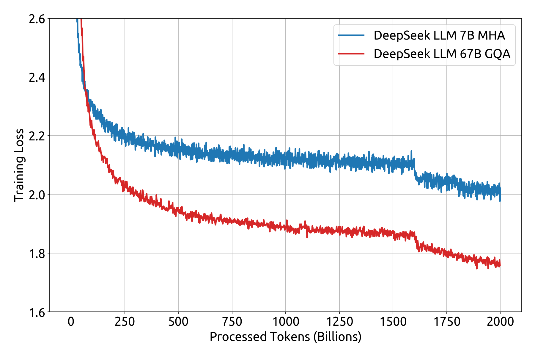DeepSeek LM models use the same architecture as LLaMA, an auto-regressive transformer decoder model. The 7B model uses Multi-Head attention (MHA) while the 67B model uses Grouped-Query Attention (GQA).