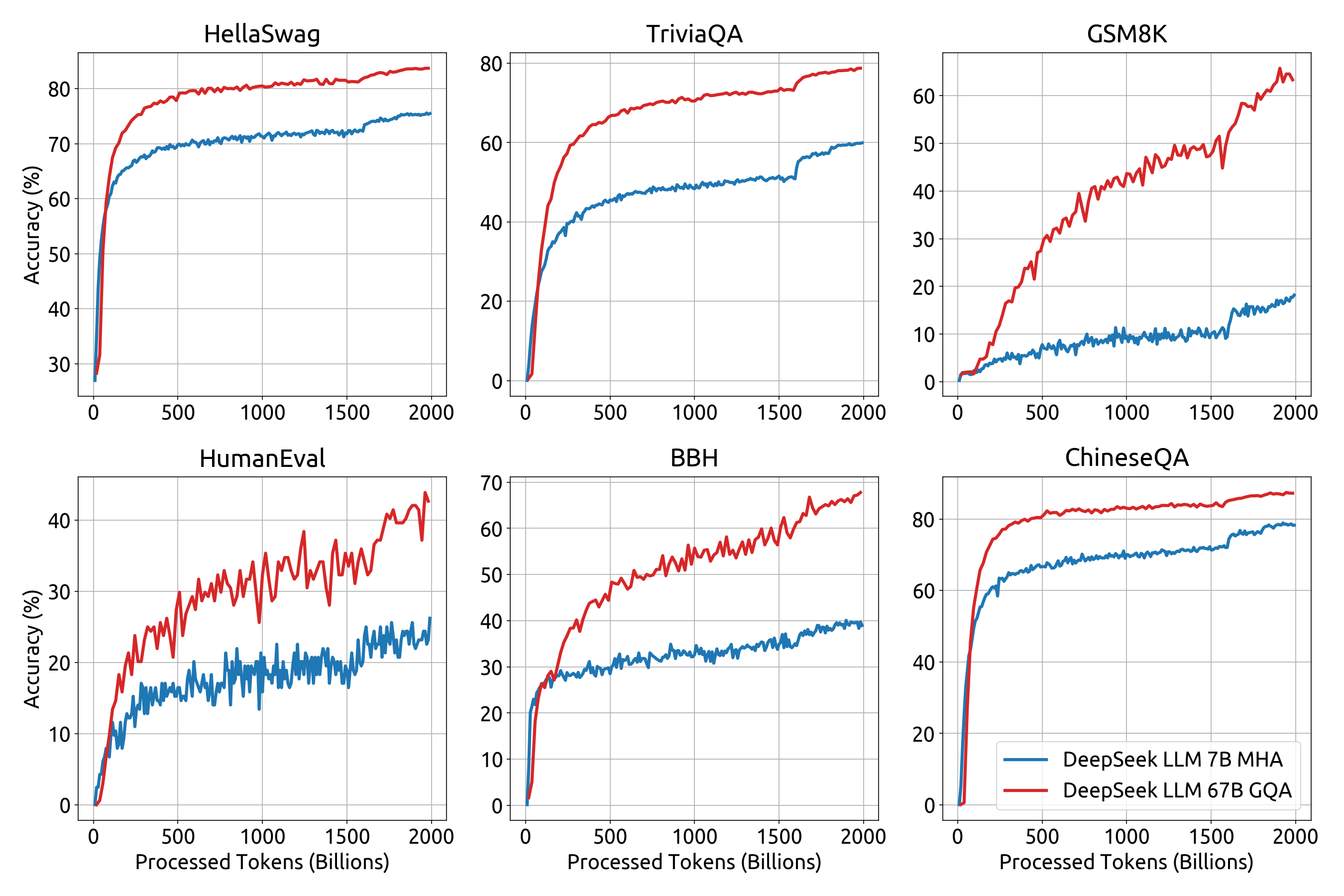 Note: +MC represents the addition of 20 million Chinese multiple-choice questions collected from the web. It is important to note that we conducted deduplication for the C-Eval validation set and CMMLU test set to prevent data contamination. This addition not only improves Chinese multiple-choice benchmarks but also enhances English benchmarks. However, we observed that it does not enhance the model's knowledge performance on other evaluations that do not utilize the multiple-choice style in the 7B setting. As a result, we made the decision to not incorporate MC data in the pre-training or fine-tuning process, as it would lead to overfitting on benchmarks.