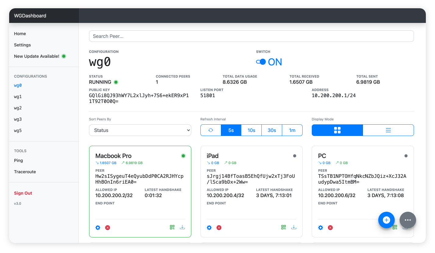 wgd.sh: Now you can update WGDashboard directly from the bash script. - Displaying Peers: You can switch the display mode between list and table in the configuration page.