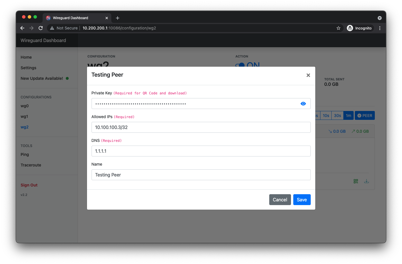 • QR Code: You can add the private key in peer setting of your existed peer to create a QR code. Or just create a new one, dashboard will now be able to auto generate a private key and public key ;) Don't worry, all keys will be generated on your machine, and will delete all key files after they got generated. [❤️ in #29]