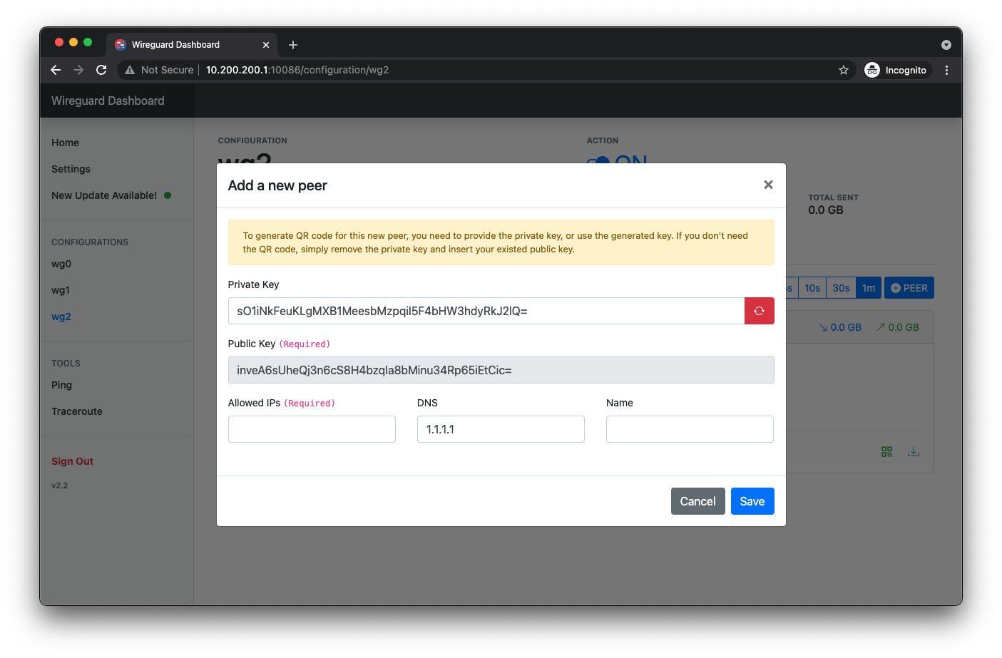 • QR Code: You can add the private key in peer setting of your existed peer to create a QR code. Or just create a new one, dashboard will now be able to auto generate a private key and public key ;) Don't worry, all keys will be generated on your machine, and will delete all key files after they got generated. [❤️ in #29]